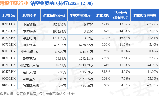 从沽空金额来看,中国移动、中国联通、中国电信沽空金额位居行业前三,分别为4573.19万港元、1952.94万港元、1709.19万港元。