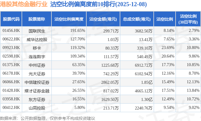从沽空比例偏离度来看,国联民生、威华达控股、移卡沽空比例偏离度位居行业前三,分别为191.65%、127.7%、119.32%。