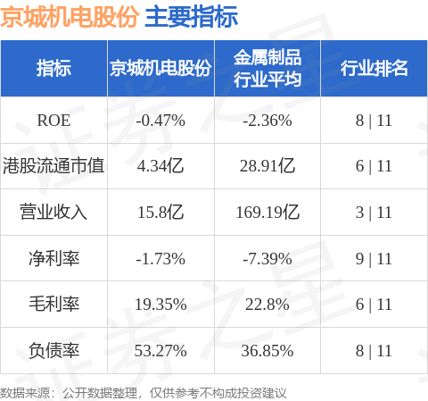 京城机电股份港股市值4.34亿港元,在金属制品行业中排名第6。主要指标见下表: