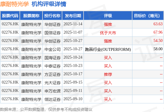 投行对该股的评级以买入为主,近90天内共有5家投行给出买入评级,近90天的目标均价为61.02港元。华创证券最新一份研报给予康耐特光学强推评级,目标价63.63港元。