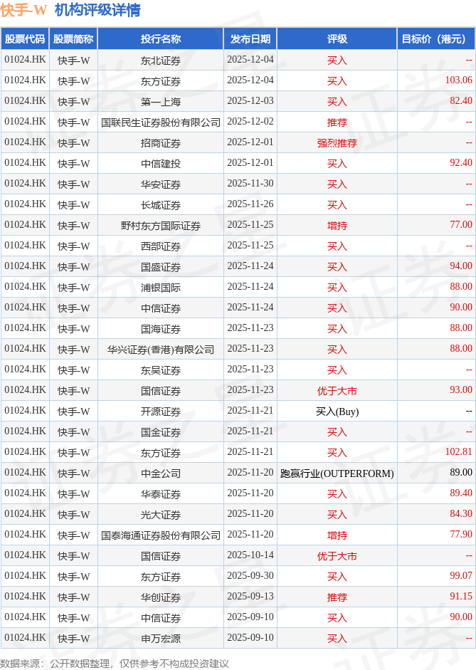截至2025年12月9日收盘,快手-W(01024.HK)报收于66.65港元,下跌2.34%,成交量2527.47万股,成交额16.87亿港元。投行对该股的评级以买入为主,近90天内共有20家投行给出买入评级,近90天的目标均价为89.97港元。东北证券最新一份研报给予快手-W买入评级。