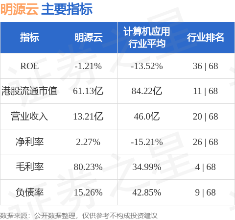 明源云港股市值61.13亿港元,在计算机应用行业中排名第11。主要指标见下表: