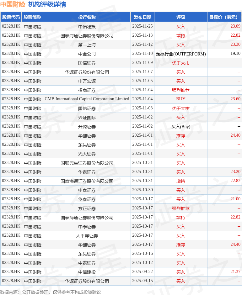 截至2025年12月9日收盘,中国财险(02328.HK)报收于16.97港元,下跌2.42%,成交量3681.25万股,成交额6.23亿港元。投行对该股的评级以买入为主,近90天内共有17家投行给出买入评级,近90天的目标均价为22.66港元。中信建投最新一份研报给予中国财险买入评级,目标价23.09港元。