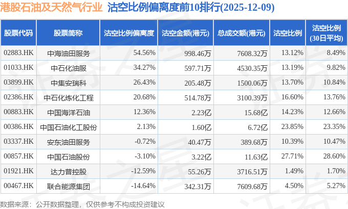 从沽空比例偏离度来看,中海油田服务、中石化油服、中集安瑞科沽空比例偏离度位居行业前三,分别为54.56%、34.27%、26.43%。