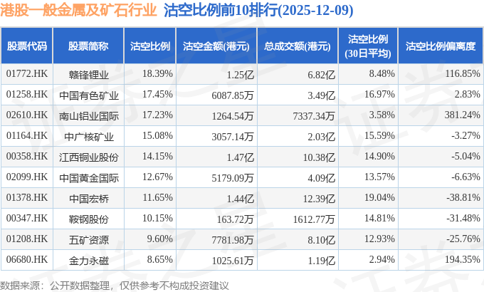 从沽空比例来看,赣锋锂业、中国有色矿业、南山铝业国际沽空比例位居行业前三,分别为18.39%、17.45%、17.23%。