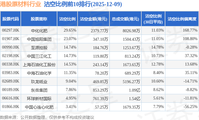 从沽空比例来看,中化化肥、中国旭阳集团、至源控股沽空比例位居行业前三,分别为29.65%、23.07%、14.74%。