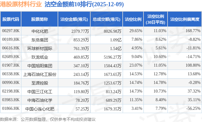 从沽空金额来看,中化化肥、东岳集团、环球新材国际沽空金额位居行业前三,分别为2379.77万港元、853.29万港元、761.39万港元。