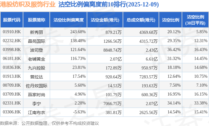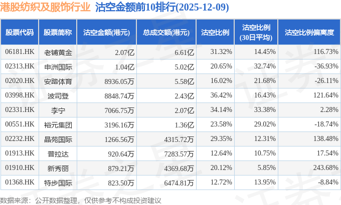 从沽空金额来看,老铺黄金、申洲国际、安踏体育沽空金额位居行业前三,分别为2.07亿港元、1.04亿港元、8936.05万港元。