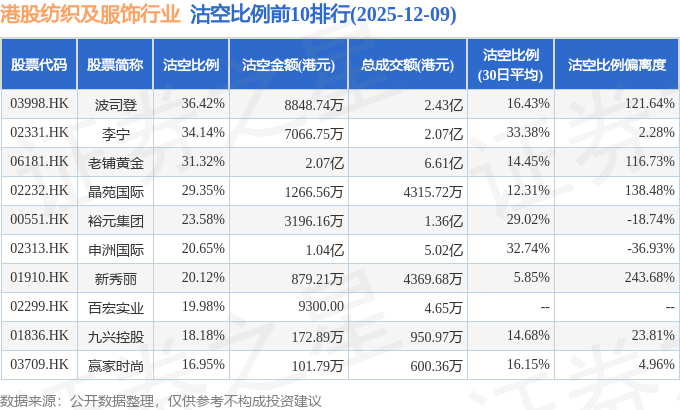 从沽空比例来看,波司登、李宁、老铺黄金沽空比例位居行业前三,分别为36.42%、34.14%、31.32%。