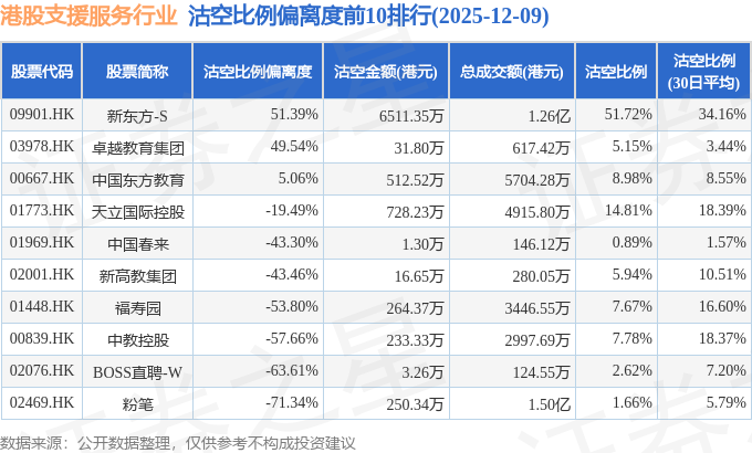 从沽空比例偏离度来看,新东方-S、卓越教育集团、中国东方教育沽空比例偏离度位居行业前三,分别为51.39%、49.54%、5.06%。