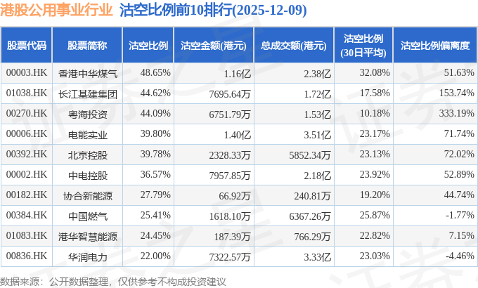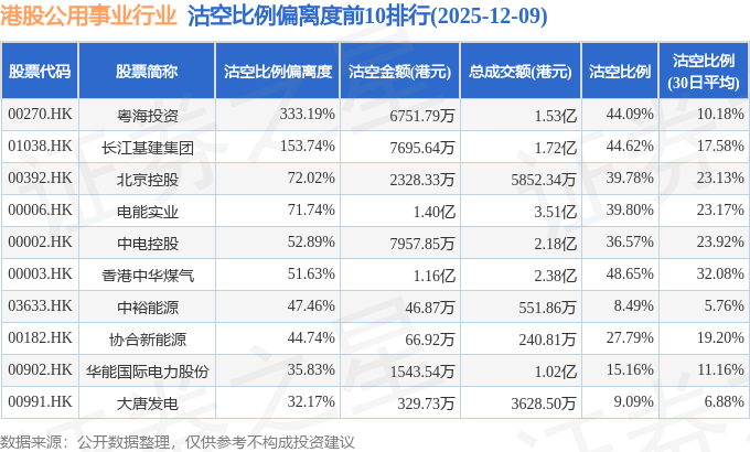 从沽空比例来看,香港中华煤气、长江基建集团、粤海投资沽空比例位居行业前三,分别为48.65%、44.62%、44.09%。