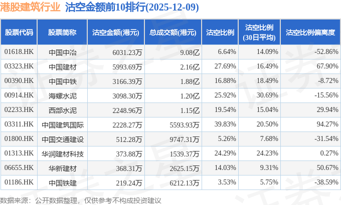 从沽空金额来看,中国中冶、中国建材、中国中铁沽空金额位居行业前三,分别为6031.23万港元、5993.69万港元、3166.39万港元。