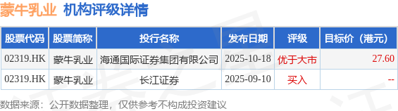 截至2025年12月9日收盘,蒙牛乳业(02319.HK)报收于14.27港元,下跌1.86%,成交量1951.99万股,成交额2.8亿港元。投行对该股的评级以优于大市为主,近90天内共有1家投行给出优于大市评级,近90天的目标均价为27.6港元。海通国际证券集团有限公司最新一份研报给予蒙牛乳业优于大市评级,目标价27.6港元。