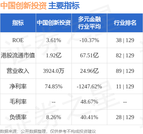 中国创新投资港股市值1.92亿港元,在多元金融行业中排名第82。主要指标见下表: