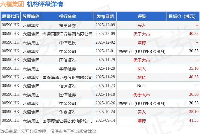 投行对该股的评级以增持为主,近90天内共有3家投行给出增持评级,近90天的目标均价为36.23港元。东吴证券最新一份研报给予六福集团买入评级。