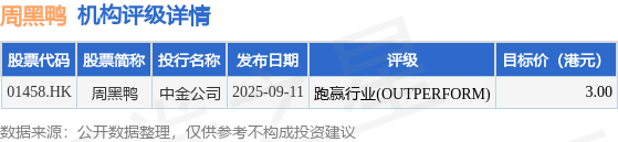 截至2025年12月10日收盘,周黑鸭(01458.HK)报收于1.68港元,上涨2.44%,成交量178.55万股,成交额295.41万港元。投行对该股的评级以跑赢行业(OUTPERFORM)为主,近90天内共有1家投行给出跑赢行业(OUTPERFORM)评级,近90天的目标均价为3港元。中金公司最新一份研报给予周黑鸭跑赢行业(OUTPERFORM)评级,目标价3港元。