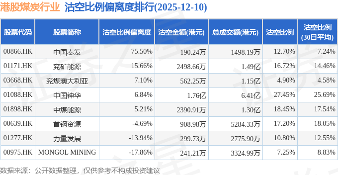 从沽空比例偏离度来看,中国秦发、兖矿能源、兖煤澳大利亚沽空比例偏离度位居行业前三,分别为75.5%、15.66%、7.1%。