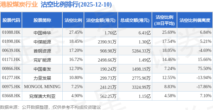 从沽空比例来看,中国神华、中煤能源、首钢资源沽空比例位居行业前三,分别为27.45%、18.45%、17.2%。