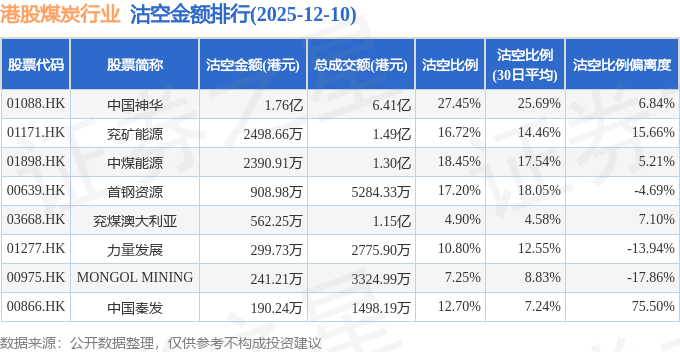 从沽空金额来看,中国神华、兖矿能源、中煤能源沽空金额位居行业前三,分别为1.76亿港元、2498.66万港元、2390.91万港元。
