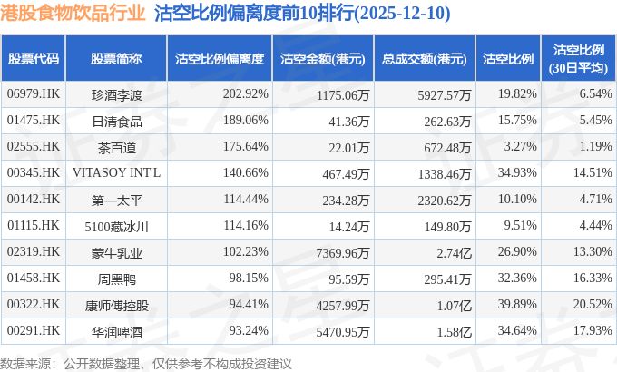 从沽空比例偏离度来看,珍酒李渡、日清食品、茶百道沽空比例偏离度位居行业前三,分别为202.92%、189.06%、175.64%。