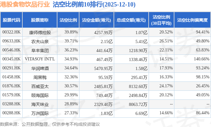 从沽空比例来看,康师傅控股、农夫山泉、阜丰集团沽空比例位居行业前三,分别为39.89%、39.71%、36.23%。