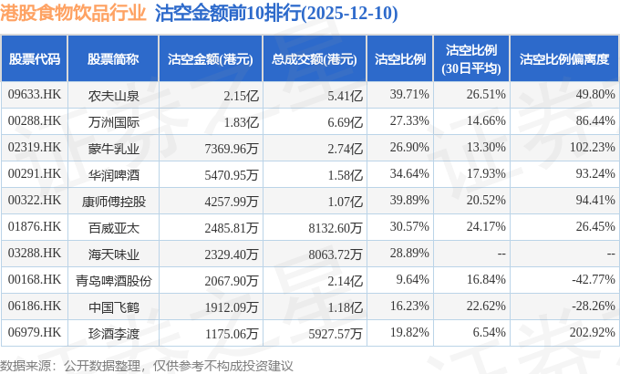 从沽空金额来看,农夫山泉、万洲国际、蒙牛乳业沽空金额位居行业前三,分别为2.15亿港元、1.83亿港元、7369.96万港元。