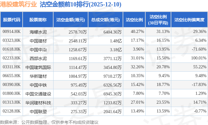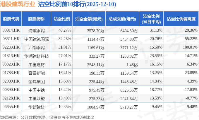 从沽空比例来看,海螺水泥、中国建筑国际、西部水泥沽空比例位居行业前三,分别为40.27%、32.26%、31.01%。