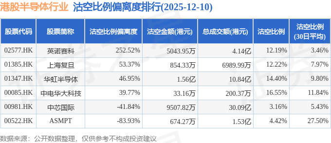 从沽空比例偏离度来看,英诺赛科、上海复旦、华虹半导体沽空比例偏离度位居行业前三,分别为252.52%、53.37%、46.95%。