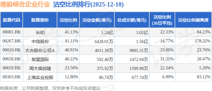 从沽空比例来看,长和、中信股份、太古股份公司A沽空比例位居行业前三,分别为41.13%、41.11%、40.91%。