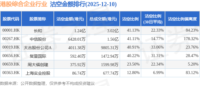 从沽空金额来看,长和、中信股份、太古股份公司A沽空金额位居行业前三,分别为1.24亿港元、6428.01万港元、4011.38万港元。