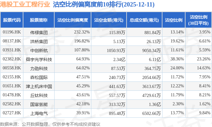 从沽空比例偏离度来看,伟禄集团、洪桥集团、中创新航沽空比例偏离度位居行业前三,分别为232.32%、196.82%、107.8%。