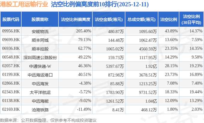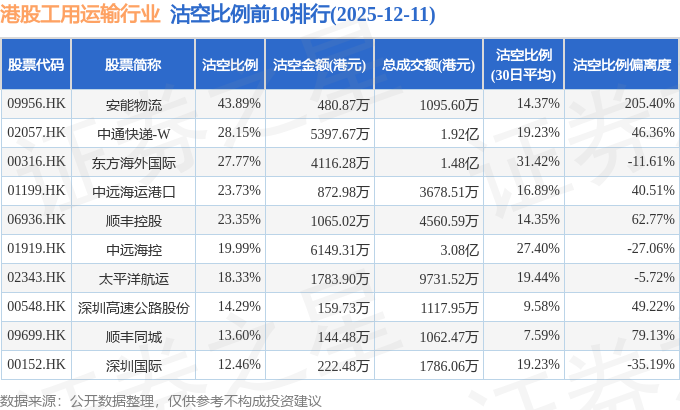 从沽空比例来看,安能物流、中通快递-W、东方海外国际沽空比例位居行业前三,分别为43.89%、28.15%、27.77%。