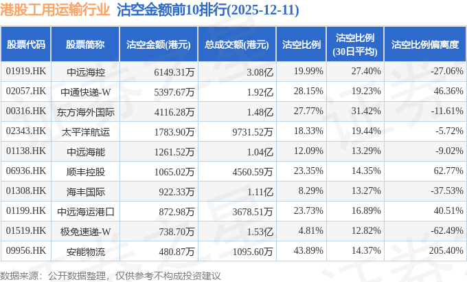 从沽空金额来看,中远海控、中通快递-W、东方海外国际沽空金额位居行业前三,分别为6149.31万港元、5397.67万港元、4116.28万港元。