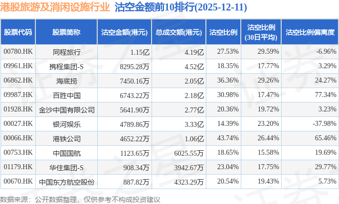 从沽空金额来看,同程旅行、携程集团-S、海底捞沽空金额位居行业前三,分别为1.15亿港元、8295.28万港元、7450.16万港元。