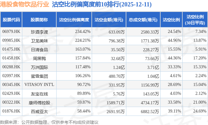 从沽空比例偏离度来看,珍酒李渡、卫龙美味、日清食品沽空比例偏离度位居行业前三,分别为234.42%、224.21%、163.07%。