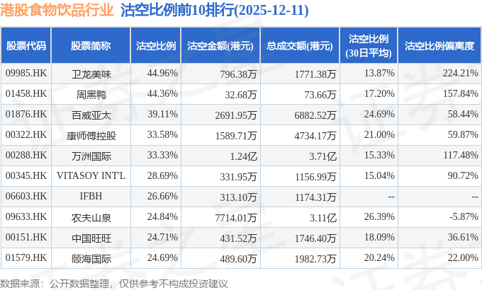 从沽空比例来看,卫龙美味、周黑鸭、百威亚太沽空比例位居行业前三,分别为44.96%、44.36%、39.11%。