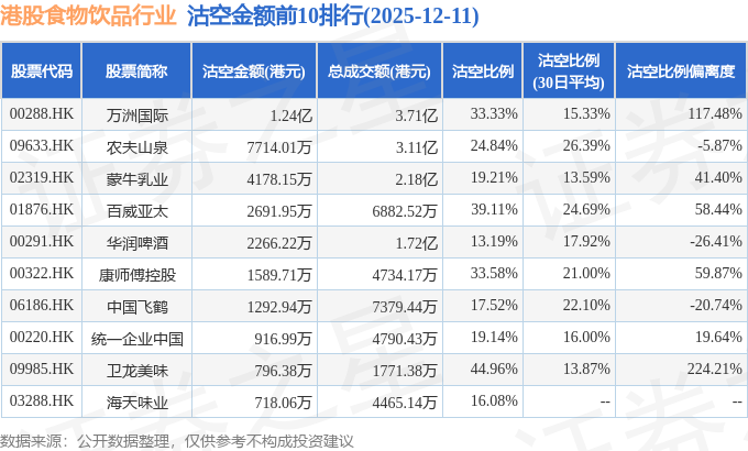 从沽空金额来看,万洲国际、农夫山泉、蒙牛乳业沽空金额位居行业前三,分别为1.24亿港元、7714.01万港元、4178.15万港元。