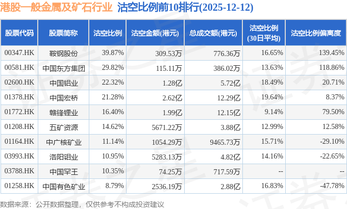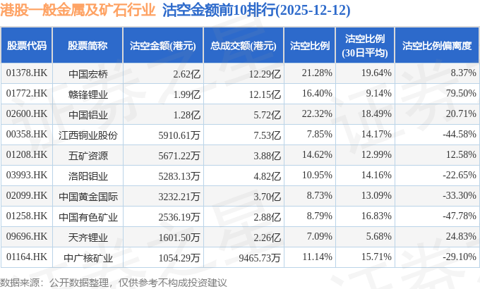 从沽空金额来看,中国宏桥、赣锋锂业、中国铝业沽空金额位居行业前三,分别为2.62亿港元、1.99亿港元、1.28亿港元。