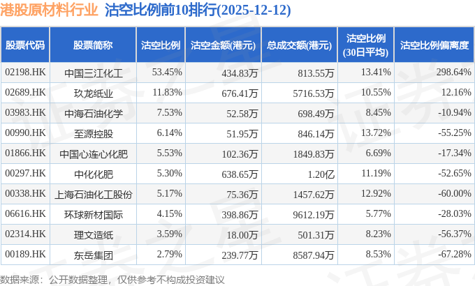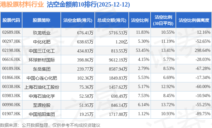 从沽空金额来看,玖龙纸业、中化化肥、中国三江化工沽空金额位居行业前三,分别为676.41万港元、638.65万港元、434.83万港元。