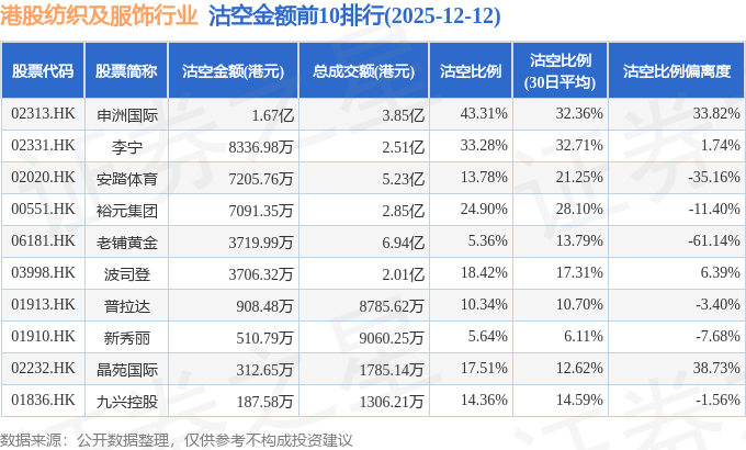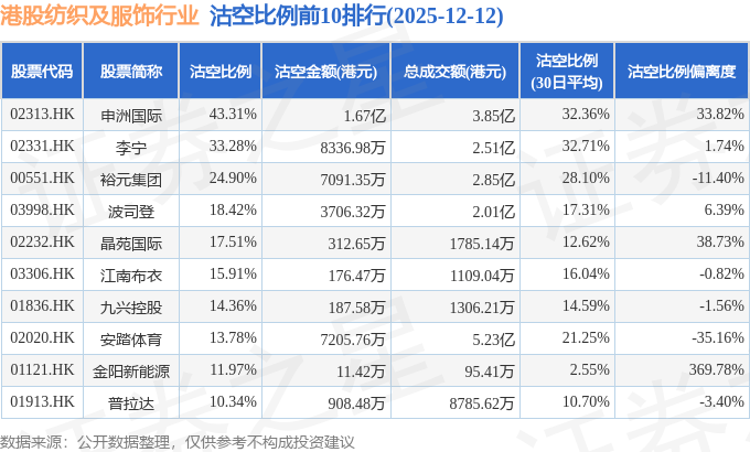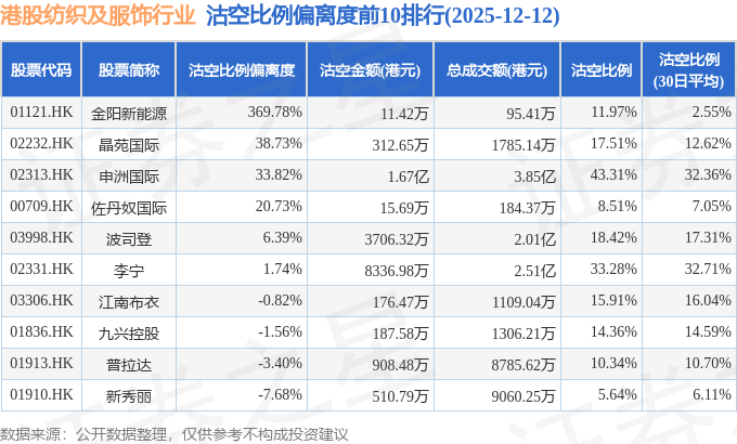 从沽空比例偏离度来看,金阳新能源、晶苑国际、申洲国际沽空比例偏离度位居行业前三,分别为369.78%、38.73%、33.82%。