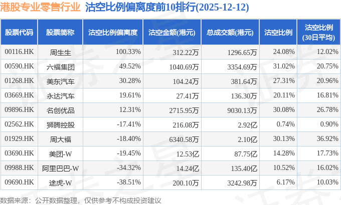 从沽空比例偏离度来看,周生生、六福集团、美东汽车沽空比例偏离度位居行业前三,分别为100.33%、49.52%、30.28%。