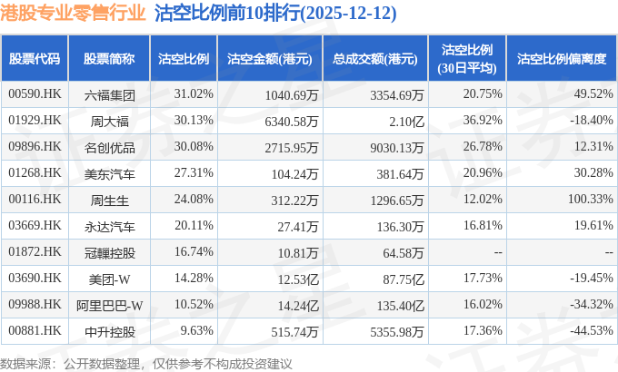 从沽空比例来看,六福集团、周大福、名创优品沽空比例位居行业前三,分别为31.02%、30.13%、30.08%。
