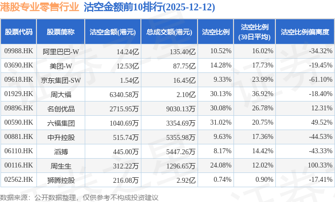 证券之星消息,12月12日港交所披露数据显示,当日港股专业零售行业的78只个股中有19只被沽空,总沽空股数为3273.64万股,总沽空金额为29.55亿元(港元),而当日专业零售行业的总成交金额为250.1亿元(港元),沽空比例为11.81%。当日专业零售行业总体涨1.67%。