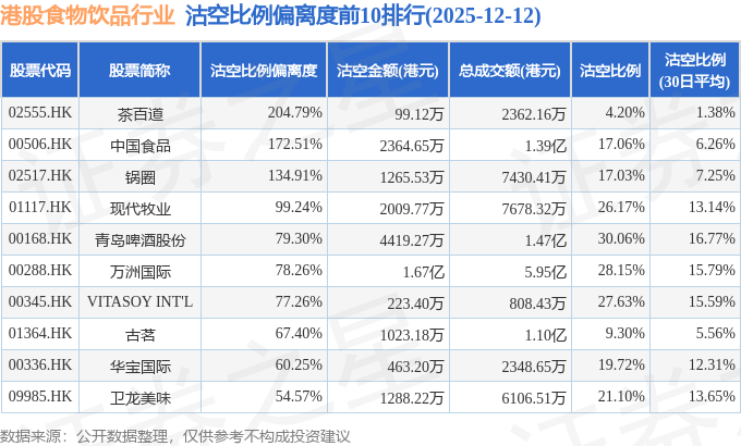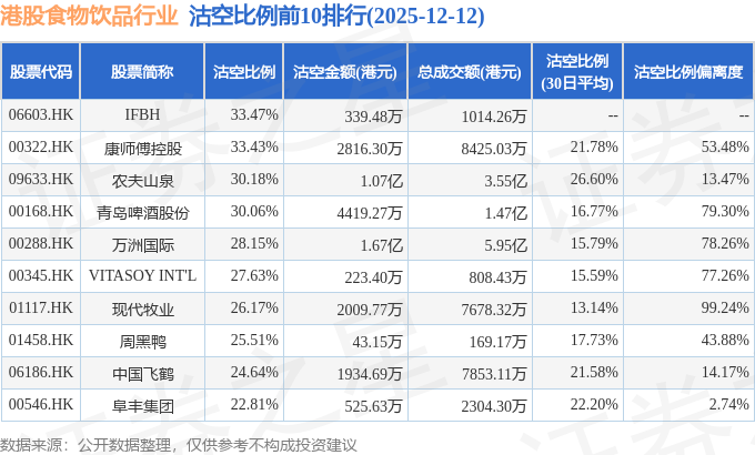 从沽空比例来看,IFBH、康师傅控股、农夫山泉沽空比例位居行业前三,分别为33.47%、33.43%、30.18%。