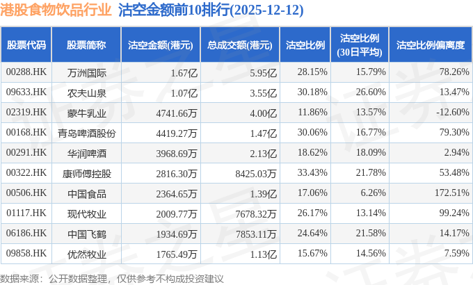 从沽空金额来看,万洲国际、农夫山泉、蒙牛乳业沽空金额位居行业前三,分别为1.67亿港元、1.07亿港元、4741.66万港元。