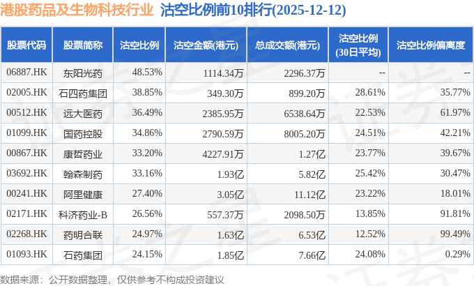 证券之星消息,12月12日港交所披露数据显示,当日港股药品及生物科技行业的159只个股中有82只被沽空,总沽空股数为1.72亿股,总沽空金额为25.39亿元(港元),而当日药品及生物科技行业的总成交金额为157.5亿元(港元),沽空比例为16.12%。当日药品及生物科技行业总体涨1.27%。