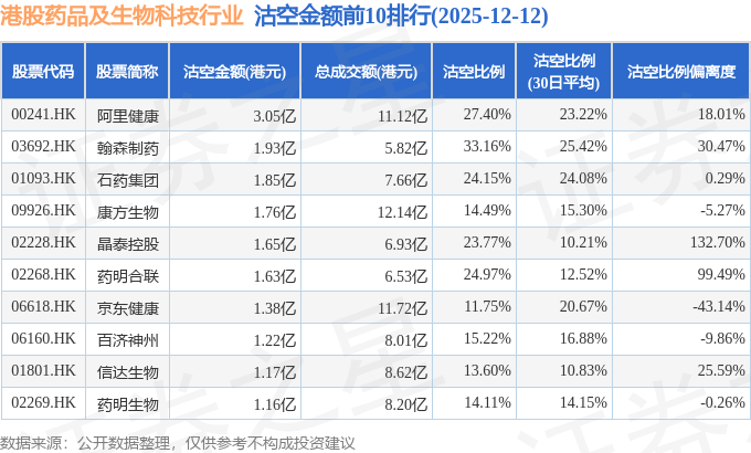 从沽空金额来看,阿里健康、翰森制药、石药集团沽空金额位居行业前三,分别为3.05亿港元、1.93亿港元、1.85亿港元。