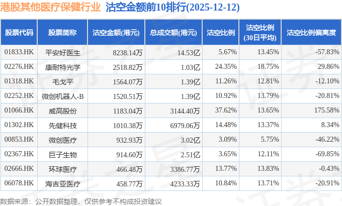 从沽空金额来看,平安好医生、康耐特光学、毛戈平沽空金额位居行业前三,分别为8238.14万港元、2518.82万港元、1564.07万港元。