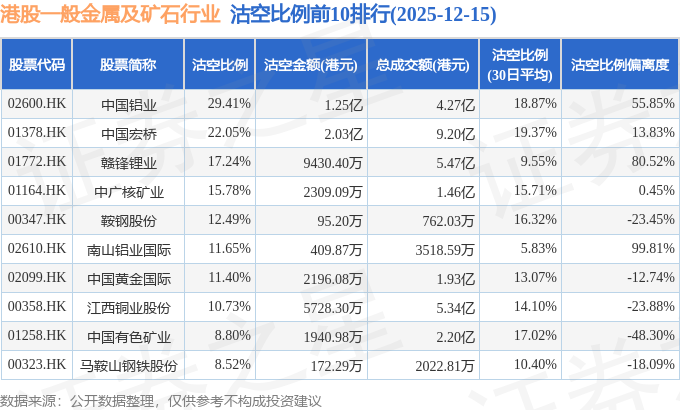从沽空比例偏离度来看,南山铝业国际、赣锋锂业、中国铝业沽空比例偏离度位居行业前三,分别为99.81%、80.52%、55.85%。