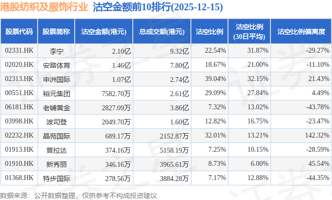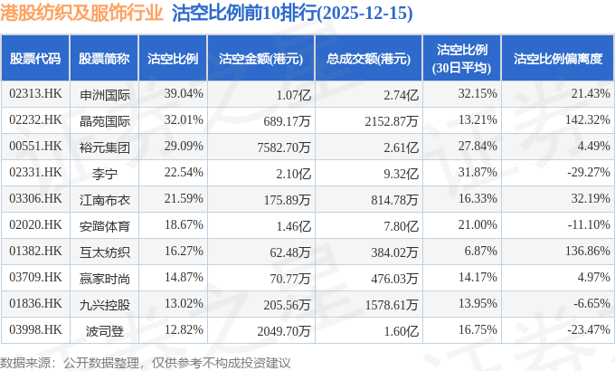 证券之星消息,12月15日港交所披露数据显示,当日港股纺织及服饰行业的119只个股中有20只被沽空,总沽空股数为2621.3万股,总沽空金额为6.11亿元(港元),而当日纺织及服饰行业的总成交金额为30.81亿元(港元),沽空比例为19.82%。当日纺织及服饰行业总体涨0.51%。